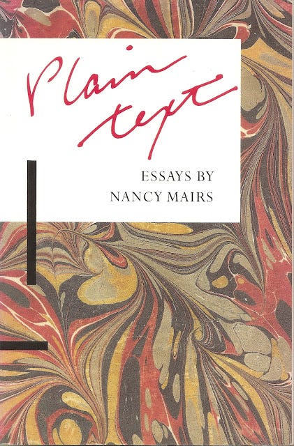 In her terrific essay "On Not Liking Sex," writer Nancy Mairs revisits an old essay she thought she'd finished, titled "On Not Liking Sex," and discovers that her earlier attitudes were sorely lacking. Near the end of the new piece she brings a skeptic's eye to narrative resolution, admitting that she craves it, but also recognizing its essential artificial demand: no more development. A hard thing to reign in, development, least of all of the personal sort. Life's just too messy: