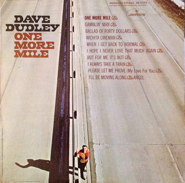 There's something comforting about a Dave Dudley album, which might be odd considering that every song on it is about departure and freedom tinged with regret as sung by a lone wolf. But then the old, bright-red Mercury label brings me back home. Dudley's 1969 album One More Mile, produced by the legendary Jerry Kennedy, is hardly unique to the singer's cannon: DD sings about the road and its lure. The title track is another winner from the venerable hand of Tom T. Hall, and was another hit for Dudley, peaking at #12 on the Billboard Country Chart in June. Dudley kept dogging it, one song at a time: