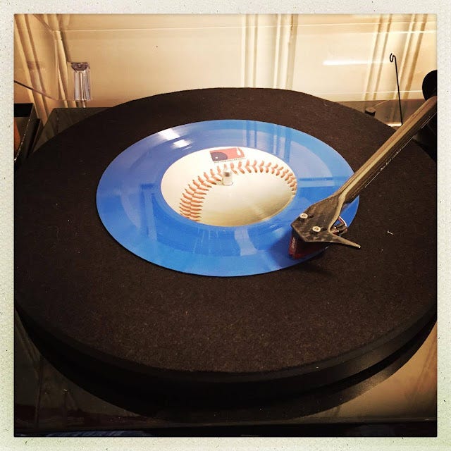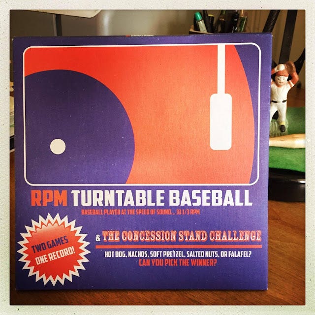 What nicer way to combat the onslaught then with a game of RPM Turntable Baseball, a 2015 Record Store Day release that a couple thoughtful friends in Rhode Island sent me for Christmas last year. Microfiche Records released the seven-inch, 33 1/3 rpm record, a follow-up to their similar turntable football game. "The envelope has been pushed a little further as this record has a whopping 13 grooves spread over one 7''," their site proclaims: