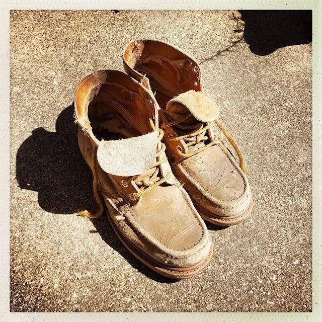 For that month of character building I bought these boots. I still own them, and wear them nearly every day when I'm working in the yard. The tread's completely worn, the tongues have given up, and the laces have long atrophied, yet the boots have held up remarkably well over thirty-plus years. They've lasted several moves, eight presidential terms, and more music fads than I can count. They slide on like slippers yet still stubbornly beat back the water when I splash through puddles. Three decades in, there's barely a tear. Apart from a handful of records and books, I count this pair of boots as among my oldest possessions. They've lasted, against all odds. There's much of me now that bears little resemblance to 18-year-old me, and yet there's also plenty that still does. These pair of modest boots have served that long continuum of selves.