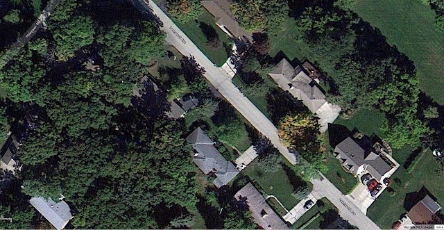 Surprises abound. I've written before about my lack of photos of myself, so it was amusing to me when I saw that Google Maps has helped to rectify that. I recently took a look at the view of our street, having read that the camera-mounted Google Map vehicles had made a re-sweep through the DeKalb area last summer, and that the satellite imagery had been updated, as well. Nothing terribly new about the image of our house, but as I zoomed in I noticed a small but bright yellow disc of light on our back deck—strange—and, zooming in to the highest degree, spotted Amy's and my shadows on the deck. What were we doing at that precise moment? Standing, yes. Talking? Looking into the yard? A moment—likely trivial, unimportant, not even significant to ourselves in hindsight, probably—captured forever, or until the next Google Maps update. It's an eerie thing, to learn that you've been photographed without knowing it, this strangeness more keenly felt when what's been captured is your thin, faceless shadow—elongated, exaggerated, rendered surreal. An ordinary moment caught in high-resolution and yet grainy in its drama, an odd gift via aerial or satellite.