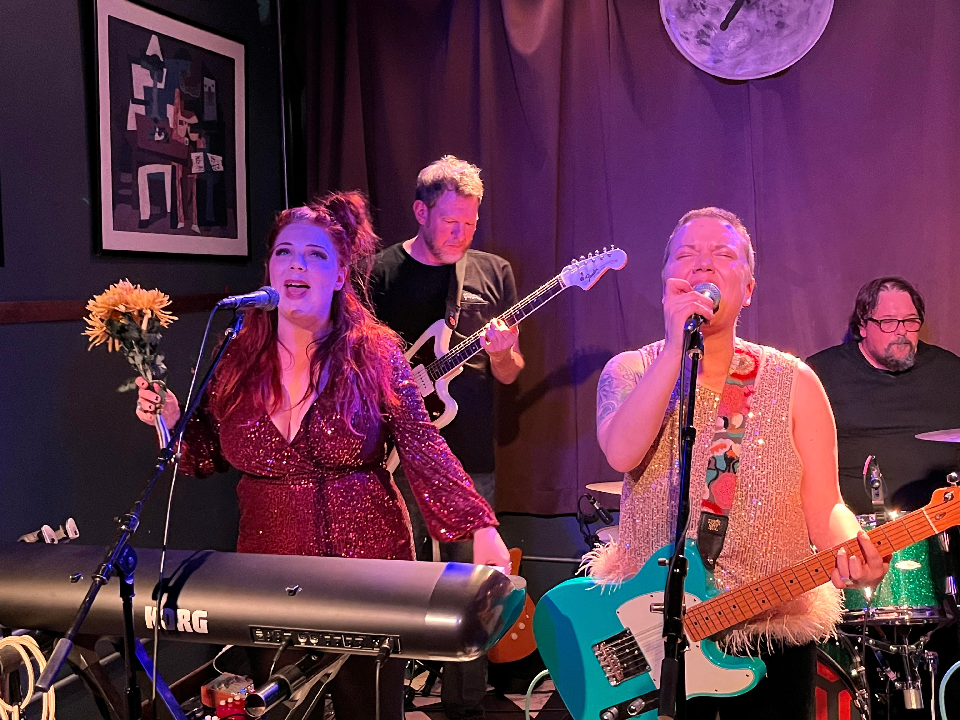 The band orbits Loveless, who was equal parts flip and self-deprecating. At the close of the opening number, she stepped back and tripped/stumbled, mouthed "Oh shit!", and laughed merrily—this set the mood for a band that plays serious songs about romance and messiness without ever taking themselves too seriously. Despite Loveless's trademark poignant songs, material devoted to love and loss, the night was fun, and also funny, the musicians goofing around between (and during) songs, suggesting there's a thin line between life in the van and life onstage with this group. During several songs her tour manager Michelle Sullivan hopped onstage to sing back-up (and groove and wave a plastic flower), following one song taking drink orders for the band; "waitress, tour manager, whatever," she muttered to me as she smilingly headed to the bar.