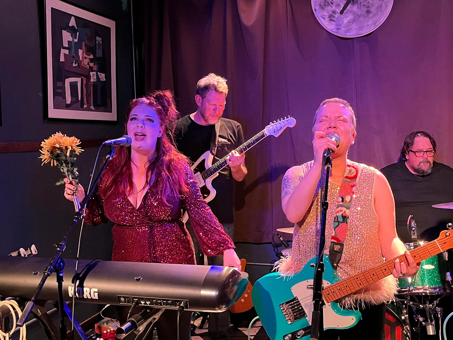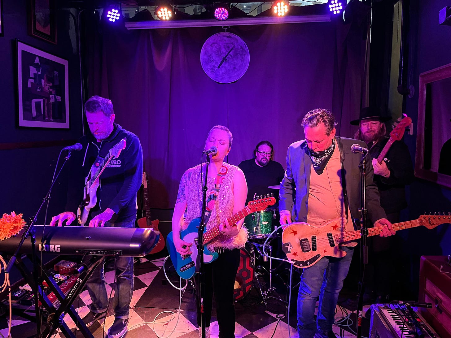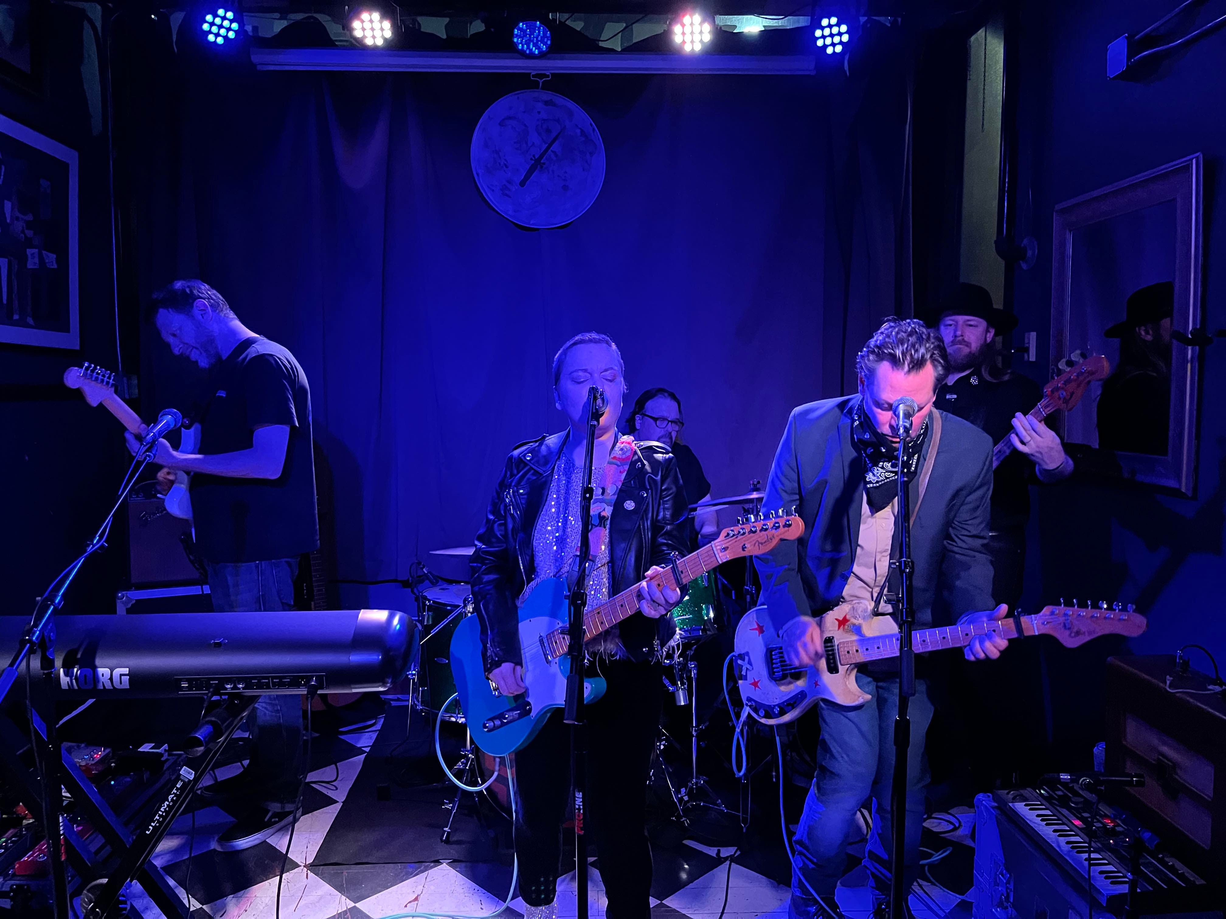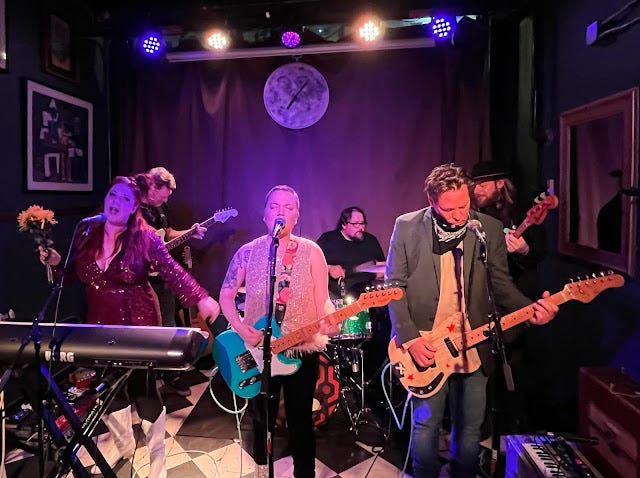 DOWN AT THE ROCK AND ROLL CLUB—I was happy to round out the year with Lydia Loveless and her band in a loose, intimate show at Golden Dagger, a tiny box of a venue in Chicago. I hadn't seen Loveless for years, and was pleased to watch her play, and goof around, with the same fellas from last time, guitarist and keyboard players Jay Gasper and Todd May and drummer George Hondroulis, along with bassist Mark E Commerce. In addition to their rhythm section, the band fit three guitarists—well, four, if you count Gasper's twelve-string—on a postage stamp-sized "stage" winkingly cordoned off with a toy-size velvet rope. Wedge in two keyboards and it was a tight fit under the lights. The old pals hit a warm groove from the opening number, and Loveless made the small space her own. The joint was sold-out (she's playing there again tonight) and the crowd was attentive and grateful, singing her songs right back to her. The woman behind me had flown in from Brooklyn for the show.