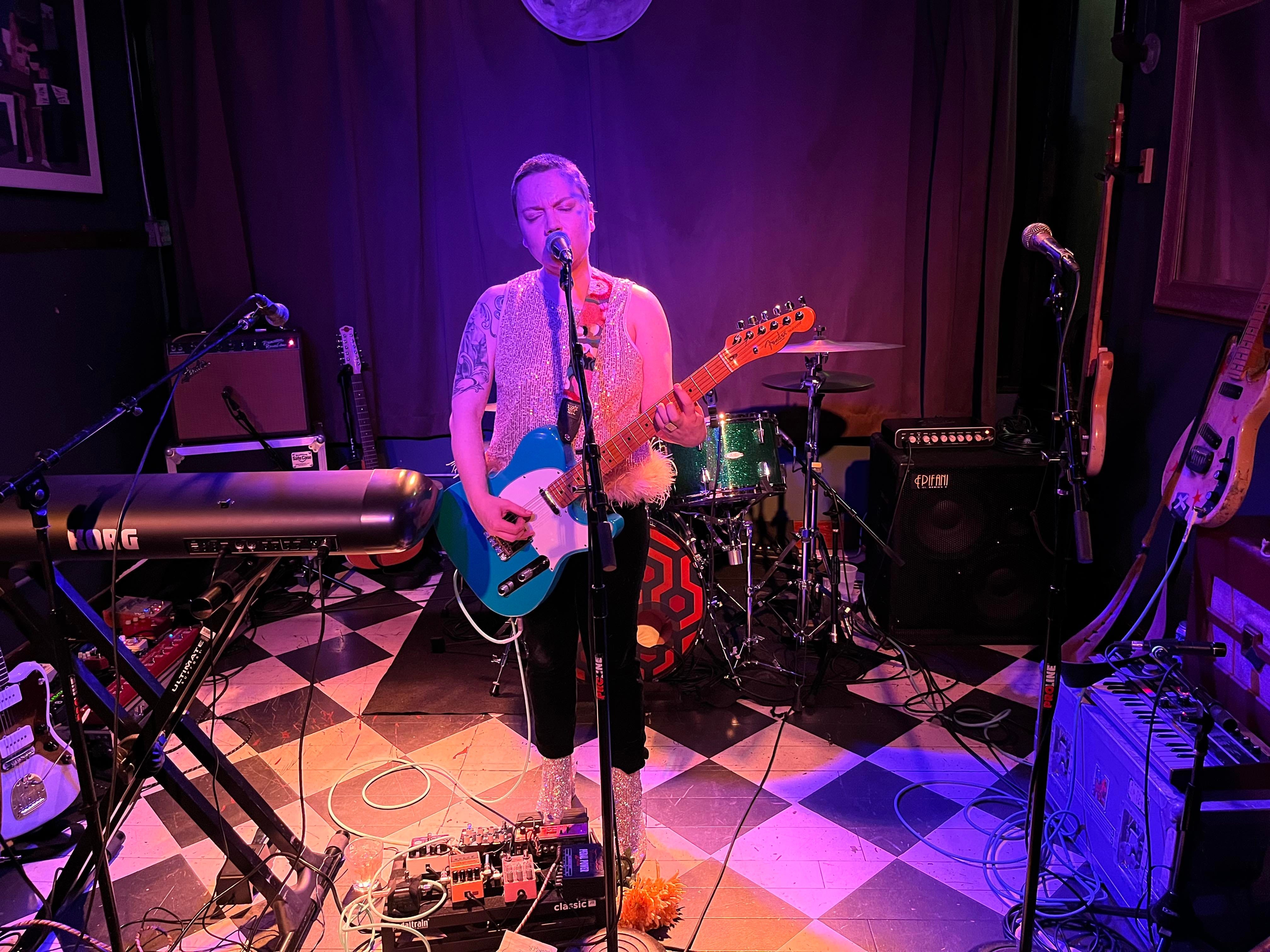 Loveless wore a spangly top, black pants, and sparkly boots. A couple of days ago she cut her hair to somewhere between a pixie and a crew cut, which makes her seem even more diminutive, and even more arresting as she belted out her songs. Her terrific band plays with loose-limbed, frayed-at-the-edges comfort, Gasper the class clown in a Metro hoodie, cracking jokes, leaning into Loveless to grinningly mock a melody hook, bandana-wearing May with an air of distraction, absorbed with his beat-up Fender, at a few points crouching on the stage to play a small keyboard. He seemed fascinated with it all.