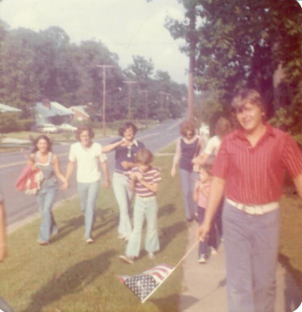 The photo also brings me back to the Bicentennial and the long day my family and some neighbor friends spent at The Mall. In 1976, only four and a half miles of the sprawling, neo-futurist Metro subway system were finished, and so from Wheaton my family were obliged to board a jam-packed bus on Georgia Avenue a block from our home for the hours-long, oppressively hot trip down to the Mall. All I remember of the blurred afternoon are endless traffic jams, the swarms of thousands, and the fireworks later that night. Yet the photo of my family marching up Arcola Avenue that morning on the way to the bus stop endures. That's me in the middle, "with piccolo fife," rocking a red-white-and-blue t-shirt and getting in the patriotic groove. Despite the analog gauze of the snapshot, that block looks pretty much the same now.