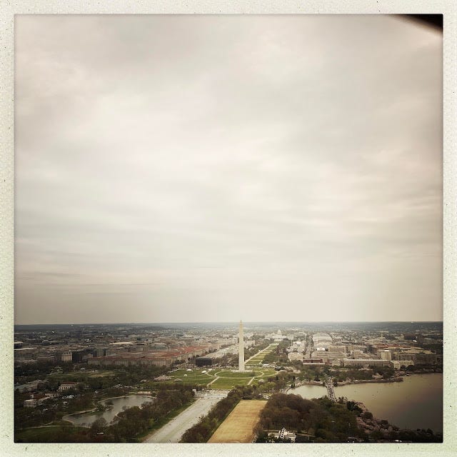I took this photo last weekend from the window of our 737, moments from landing at Reagan National Airport. The vast gray sky's appropriate, as it mirrored my cloudy memories of the Washington D.C. area and my ambivalence about having left so many years ago.