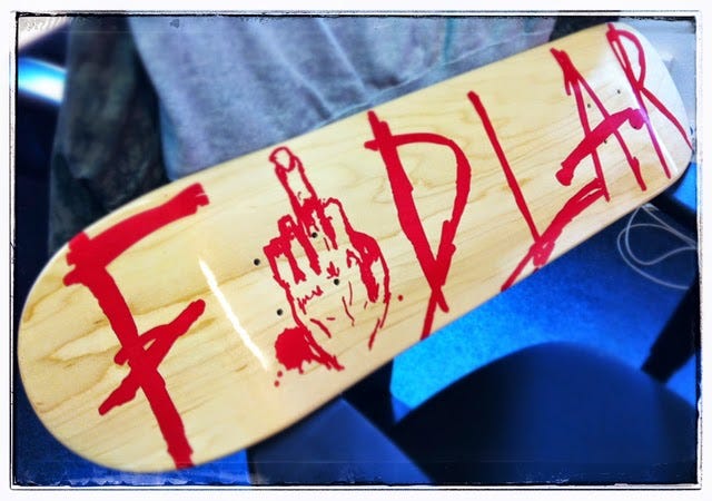 and figurative blur on the periphery. FIDLAR's on wheels, too, though their motivation to get up and out is a little less giddy, and a lot darker: "I do a bunch of drugs / I'm a fiend / I'm an addict / I'm all messed up / Watchin' television static." The goal: "I'm gonna try and make it / For another year / Just to hang out with my best friends / And drink a lot of beer." The singer's cheap, broke, without a job, phone, or "a life." Then why am I smiling? Because despite their stoner ethos, punk regalia, and speedy Millennial ennui, the guys in FIDLAR are riding, in low-rent spirit, the same nutiness and few chords powering the clean-cut, besuited guys in the Twiliters forty years earlier: their lanes might be faster, but the speed's the same. Loud, fast, needle in the red, the details are as similar as they are disparate: roller skates, skateboards, beer, weed, just hanging out. LBJ or Obama. Transistor radio or Spotify. A locally-pressed 45 or an mp3 in seconds. Rock and roll, it's like the weather, or the law. It's all around, and will outlast us and fuel the kids who aren't born yet.