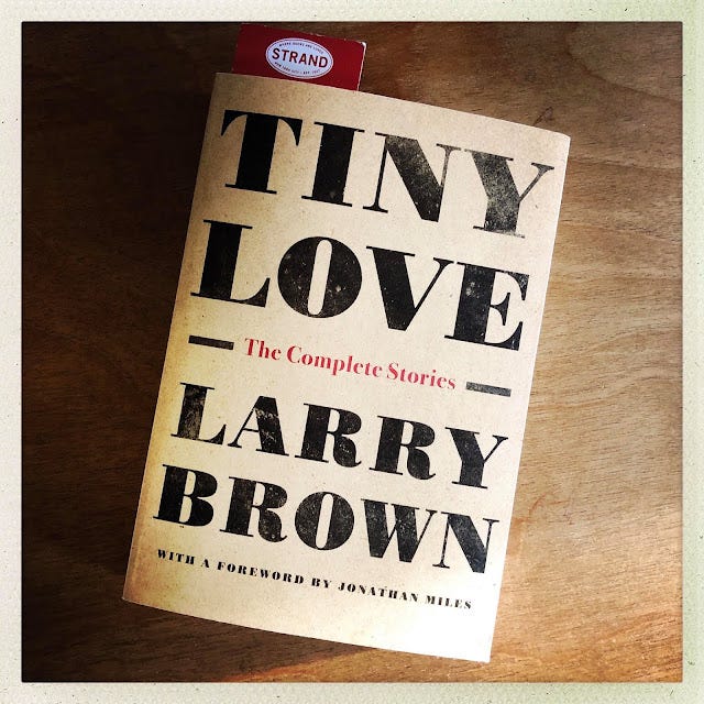 There are some bands to whom I'll always return, and some writers. For the past week or so I've been savoring Tiny Love, the complete collection of Larry Brown's short fiction, just out from Algonquin Books. (Brown died in 2004.) Though I know all of these stories by heart, save for the six previously uncollected, I continue to marvel at Brown's talky and intimate language, his sparse but evocative narrative details, and his lovely, fucked-up characters—men and women, mostly men, caught between their good intentions and their demons, between the knowledge that what they're doing is messed up and their inability to stop messing up. Brown wrote about drunks and derelicts with genuine respect for their suffering and their regrets, dramatized them with humanity and dimension, and that, I think, is his great legacy, and that generosity of spirit is among the reasons why I return to his work. He wrote about his characters' excesses and indulgences—in drink, sex, solipsism, general disregard for the requirements of adulthood—not as romantic fuck-you's or decadent stays-against-The Man but as ambivalent, lived-in responses to low-ceiling fates, to the daily dramas and tragedies brought about by alcoholism, though I don't think Brown used that word too often when conceiving of or talking about his characters. He did struggle with alcoholism himself, and was honest about it to friends and interviewers, if not always with himself. He also had a remarkable ability to evoke the landscape of northern Mississippi as both external to and deep within the characters; they loved and breathed it as weather. And though Man versus Nature might be the well-worn way to describe his characters' dilemmas, the line between those men and women and the lovely though brutal, Naturalistic world they lived in was so narrow as to be invisible.