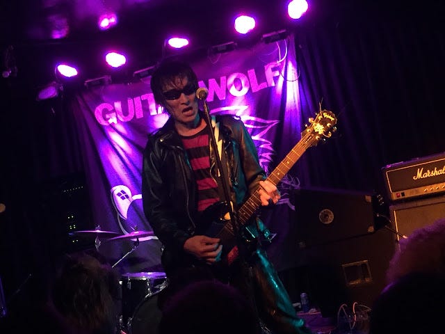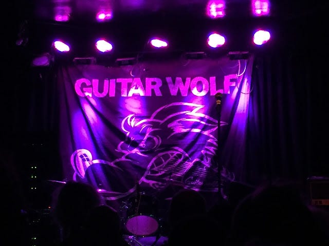 DOWN AT THE ROCK & ROLL CLUB—Guitar Wolf bludgeoned the crowd at Beat Kitchen last night, hitting the stage wearing Godzilla masks and departing after an hour and a half of ear-ringing mania, assisted by handlers to the dressing room as if they were walking wounded. (One aspect of Beat Kitchen I love: bands need to walk through the crowd to approach and to leave the stage, like ballplayers had to do after games at the old Polo Grounds, reaching the clubhouse in center field.)