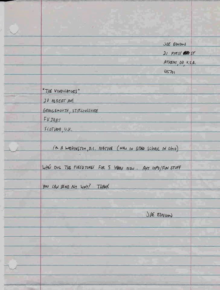 Longtime rock and roll town-crier Lindsay Hutton (The Next Big Thing) kindly sent me a scan of this letter I wrote to him back in 1988. I'd just moved from Maryland to Ohio, and had seen the address for The Vindicators, the Fleshtones fan club that Hutton ran, on the back of one of the Fleshtones' albums. In the late 1980s it was tough to find much news about the band. As I'd come to learn, there were experiencing a bit of a rough patch at the time, the first of many. They were "among" bass players, weren't playing away from the east coast all that often, were dealing with substance abuse issues, and had no American label, not even the rumor of one. I wouldn't see the band live again until 1992 or '93, by which time Ken Fox had been playing bass for a few years and the rough waters were behind them. For a while, anyway. So, cheers to Lindsay for keeping the Super Rock flame going during turbulent times—and in Scotland, of all places. In the early 1990s Anne Streng would begin the band's Hall Of Fame, keeping fans of the band well-informed with mailings and updates, until Steve Coleman began running the band's website in 1995.