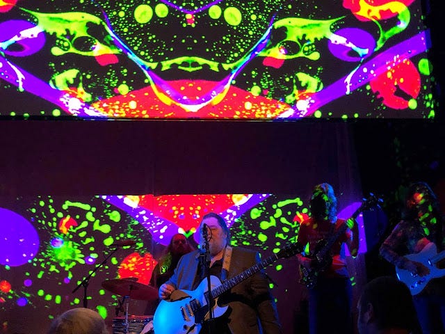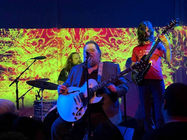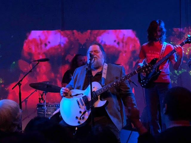 DOWN AT THE ROCK & ROLL CLUB—I paid overdue respect to Roky Erickson last night at Lincoln Hall in Chicago. Erickson, who's had highly publicized bouts with mental illness in the past, and an up-and-down career, is something of a legend among rock and rollers. He was led by his guitarist to a leather high chair at the front of the stage, where he sat, virtually immobile and silent, when he wasn't signing, for the duration of the show. I'm not sure that his guitar was plugged in; I couldn't hear his playing, anyway, but it didn't matter. His physical presence coupled with the decades of strife almost visible around his face and ample body stole the show. Now 71, wearing a gray sports jacket, black pants, and slippers, gently smiling, Erickson gives the impression of a content, bearded Buddha, sitting patiently with his fingers laced together over his stomach as his lead guitarist, the show's emcee, announced the next song or tuned his guitar. Erickson's band is supremely tight and they play warmly; the rhythm section looks like they could gig in a Ten Years After tribute band if they wanted to, and that's accounting for their considerable chops and ensemble playing more than their hirsute, hippie appearance. Erickson, well, he sang and warbled and yelped, muttering a quiet "thank you" during the show only once (ignoring the thinks-he's-funny idiot in the crowd who yelled "Speech! Speech!" once or twice). The songs ranged from up-tempo rockers to blues-based ballads, and when Erickson was plugged-in emotionally, such as on "Starry Eyes," a wonderful tribute to his wife, he sang with honest depth, his eyes often shut against the mood; he seemed to belie his large body by mentally floating off and vibing with the songs as they were played. Quirkier and offbeat tunes "I Walked With a Zombie," in which Erickson spun a yarn without telling a story, "Johnny Lawman," and "Two-Headed Dog," and 13th Floor Elevators' classics "(I've Got) Levitation" and the inevitable closer "You're Gonna Miss Me" found Erickson alternating between leading the vocal charge, his eyes alight, and letting the songs' infamy do most of the work for him. He left without an encore, shuffling off the stage with the aid of the guitarist who'd walked him on earlier, his legacy assured and his present still charged.