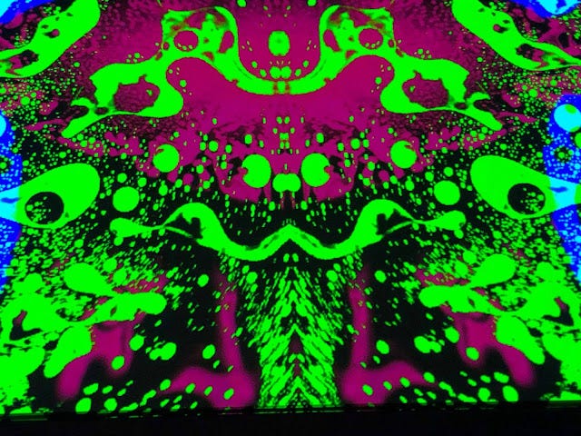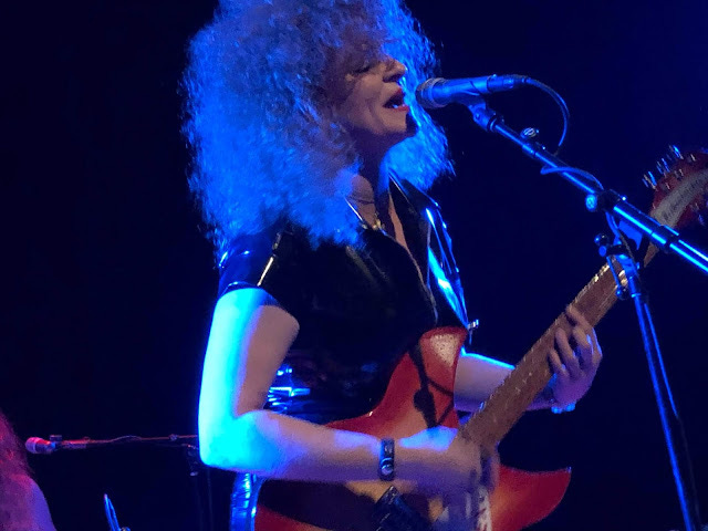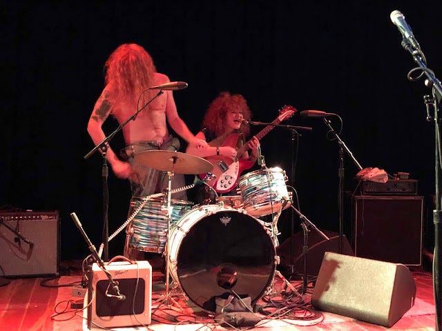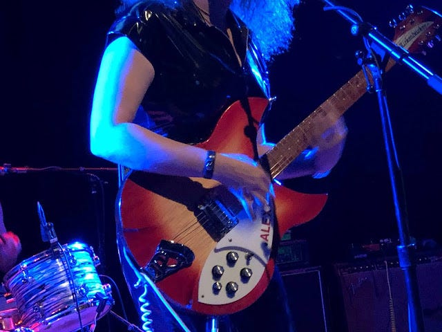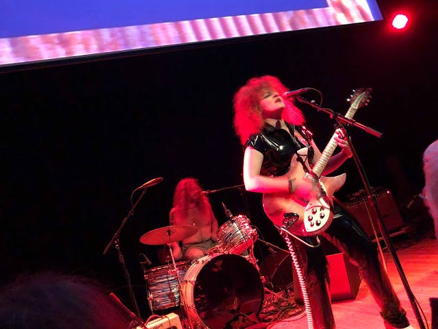 During the show Lincoln Hall projected a swirling psychedelic light show on a large screen above and behind Erickson and his band, and it felt as if the display had been percolating since White Mystery's storming opening set. I'm a fan of Miss Alex White & Francis Scott Key White, two Chicago siblings who raised the roof last night with their powerhouse glam rock roll funk lo-fi blues. Miss Alex plays charged and stirring riffs and screechy Hendrix-like wails on a sunburst Rickenbacker, and wore a black latex bodysuit and white platform boots, her red hair teased in a 'fro. White Mystery's songs are sexy, anthemic, and a little dark, rousing but, yes, mysterious, too. The band has been on the road with Rocky Erickson for two weeks and though clearly amped to be playing in front of a home crowd, the duo showed a bit of road burn, at least relative to the electrifying show of theirs I caught at The House in DeKalb a few years back. Francis Scott Key White gave the impression of someone who'd slept through sound check and woke up just in time to forget to button his pants but still man the drums, chugging behind Miss White's righteous riffing. At the end of the set, the drummer and guitarist switched places, a standard move of the theirs; while he mumbled incoherent poetry into the mike, she sat behind the drums but still kept riffing on her guitar as she thumped a four-on-the-floor with the bass drum. A perpetual motion machine, White Mystery. At the end of the set Miss White sweetly informed the crowd that her parents were in attendance. (Her mother Diane White is a celebrated Chicago photographer; among other accolades she shot iconic photos at the infamous Disco Demolition at Comiskey Park in 1979.) It's that kind of homey, bro-and-sis charm coupled with the band's nervy eroticism—a crowd-pleaser was the tune "Fuck Your Mouth Shut"—that ignites and moves this band. I highly recommend you do the White Mystery thing in your town if you haven't.