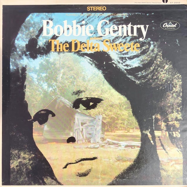 The Delta Sweete is one of my favorite Bobbie Gentry albums, and hands down my favorite of her album covers. The image of Gentry superimposed over a dilapidated backwoods shack is both of its era and timeless, a graphic illustration of the complications of homesickness, and the album's interested in that uneasy blend of sentimentality and realism. I wrote a few years ago in The Normal School that because The Delta Sweete didn’t match the commercial success of Gentry's debut Ode to Billie Joe, it’s remained a sadly underrated Americana original, an imaginative collection of linked songs about the tensions of Southern life near the close of a tumultuous decade, the bulk of it written by the Mississippi-bred Gentry. (Paired with her 1970 album Local Gentry, The Delta Sweete was reissued in 2006 by the Australian label Raven, and again last year as part of the mammoth and long overdue compilation The Girl From Chickasaw County: The Complete Capitol Masters). The liner notes promised a concept of sorts, narrative songs concerning “the dust, the fragrance, the molasses, grits and grit, the love, sorrow, and the humor of the Delta country…the people, young and old, bad and good, from Monday to Sunday.” Producer Kelly Gordon and arrangers Jimmie Haskel and Shorty Rogers seemed to have had in mind a kind of pop-rococo storyscape, a yoking together of genteel and melancholy steamboat-era strings and brass with earthy, bedrock rural balladry, blues, and soul—a fascinating and illuminating blend of styles.