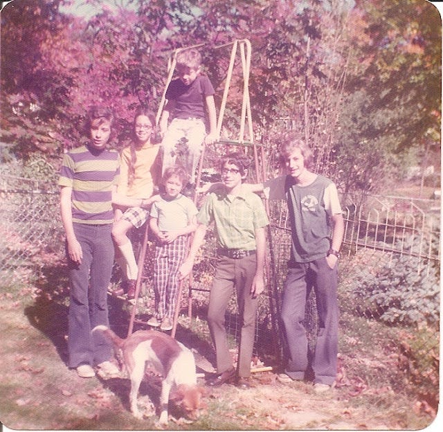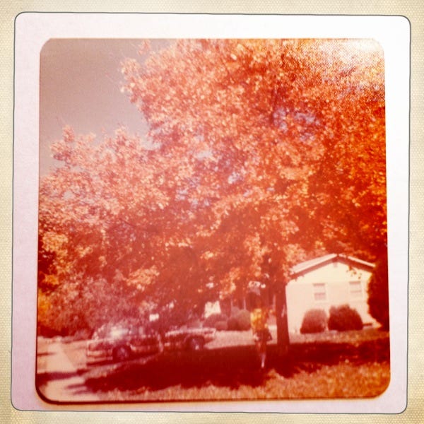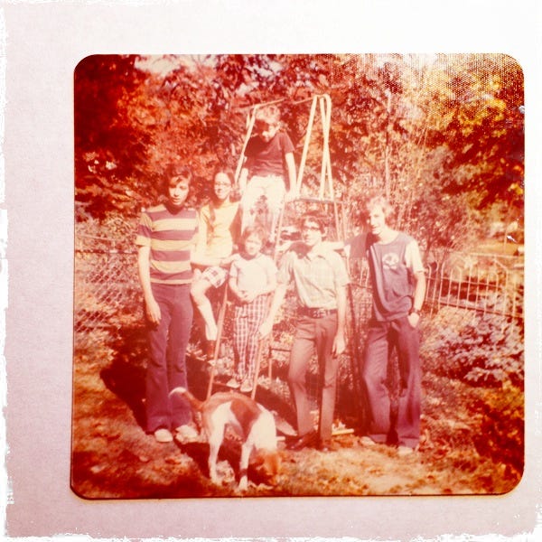 William M. Ivins, Jr. wrote, "Photography, from being merely another way of procuring or making images of things already seen by our eyes, has become a means of ocular awareness of things that our eyes can never see directly." Yeah, and I wanted to see what happened when I sent some genuine vintage photographs through Hipstamatic's arch retro filters. Here are three family snaps from the Spring of 1974, the first of my childhood dog, the lovely mutt Molly; the second of my family (me and my four brothers and sister [I'm the one looking disconsolate — or is it afraid? — at the top of the ladder]); the third an image that I hold immoderate and boundless affection for, one of the few images from adolescence that's on permanent rotation in the mental slide library: a shot of the crab apple tree in our front yard with my sister posing beneath in her Easter Sunday dress. This single shot has become for me a kind of master image for the Spring, the enormous tree exploding reds and pinks to all corners, the April sun nearly washing out everything in its benevolent appetite, my pre-teen sister posing demurely beneath the day's green machinations, overwhelmed pictorially by fecundity and warmth of a suburban Sunday.