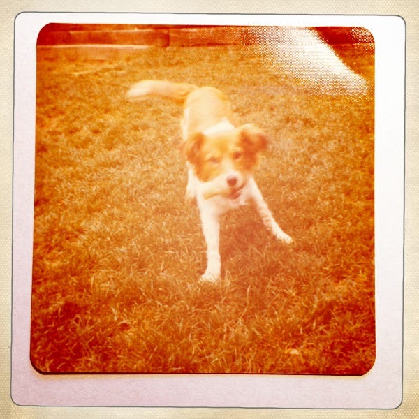 Using Hipstamatic, I took a photo of each of these photos against a white background. The effect was interesting. The blur of light at the top right corner of the image of Molly resulted from a bend in the photograph; beyond that, Hipstamatic didn't do much to my dog. However, in the second and third photographs the lenses and film that I selected (Kaimal Mark II lens and Kodot XGrizzled film in the second; Kaimal Mark II lens and Ina's 1969 film in the third) cast the original photos into another dimension: faux vintage steeped in the past. Odd, and interesting, but strange. What occurred was a kind of advertisement for my own past, how the mid-1970s looks as reimagined by contemporary software engineers. My family is now iconographic, anyone's, and my sister a type of girl from the decade. Much of the personality and character in the photographs is curiously drained, for me anyway, when the filters are applied, perhaps as a result of the software's bleaching effect. When a photo from the past is run through Hipstamatic, the photo is rendered generic. What does that say.