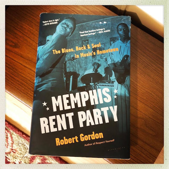 Robert Gordon's new book Memphis Rent Party: The Blues, Rock & Soul in Music's Hometown is wonderful. In it, Gordon gathers his many magazine pieces over the years, and in a pleasingly noisy kaleidoscope captures the warmth, freakiness, and unique history of Bluff City and its music-making denizens, from Sam Phillips, Jerry Lee Lewis, and Alex Chilton to Tav Falco, the Fieldstones, and Bobby "Blue" Bland, and many more in between. Gordon writes with humor, great respect, and honesty about his city's unfortunate cultural divides, its hidden gems, its juke joints and dive bars and picnics, and its hard-earned humanity. So many of the places Gordon writes about are long gone, as are many of the people he profiles, but his writing is so detail-rich and narratively engaging that the city and its outskirts feel palpably present, page after page. I half-expected my clothes to smell smoky after reading about some of the dimly-lit bars and joints Gordon has obsessively, affectionately haunted over the years, and that he brings to life in his pieces.